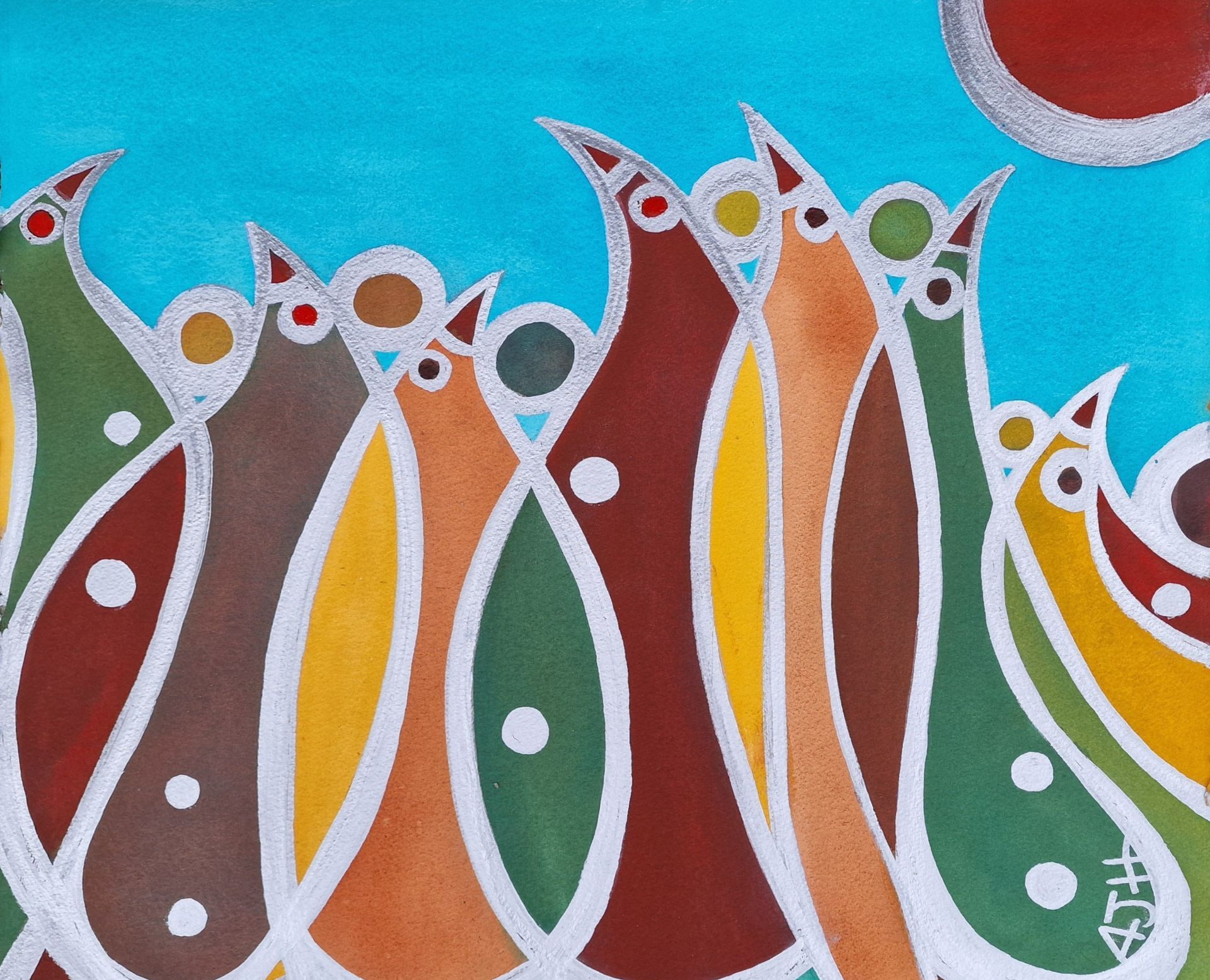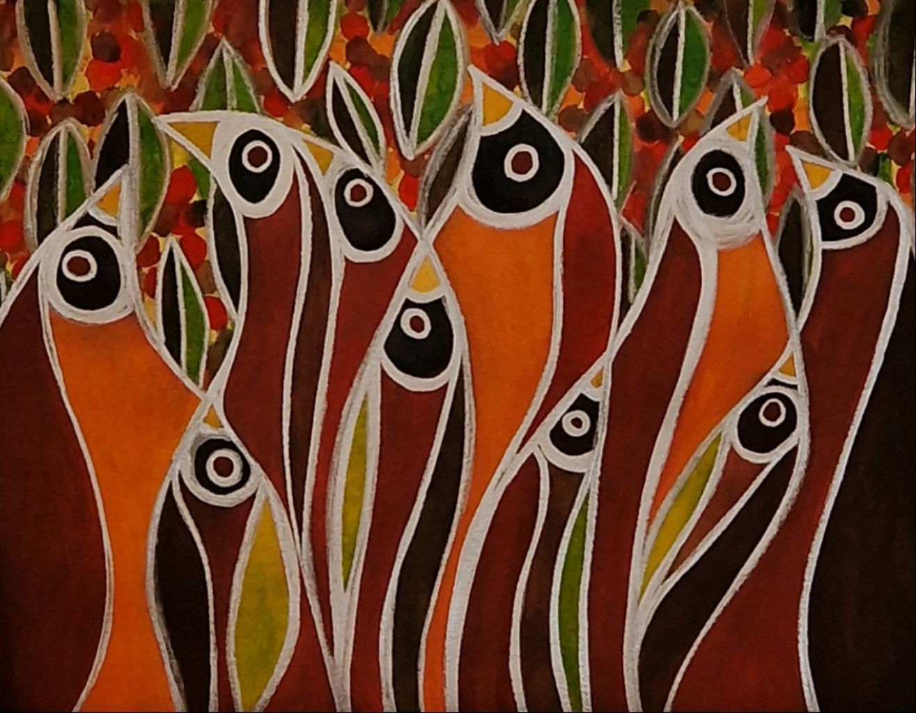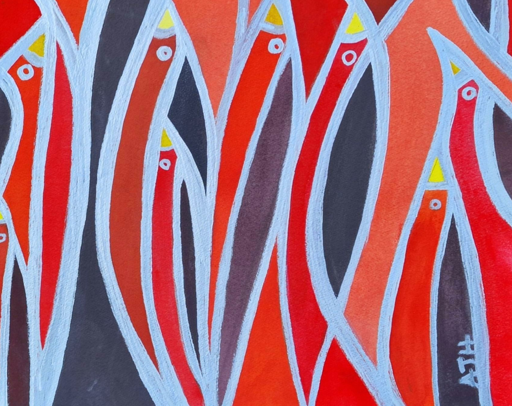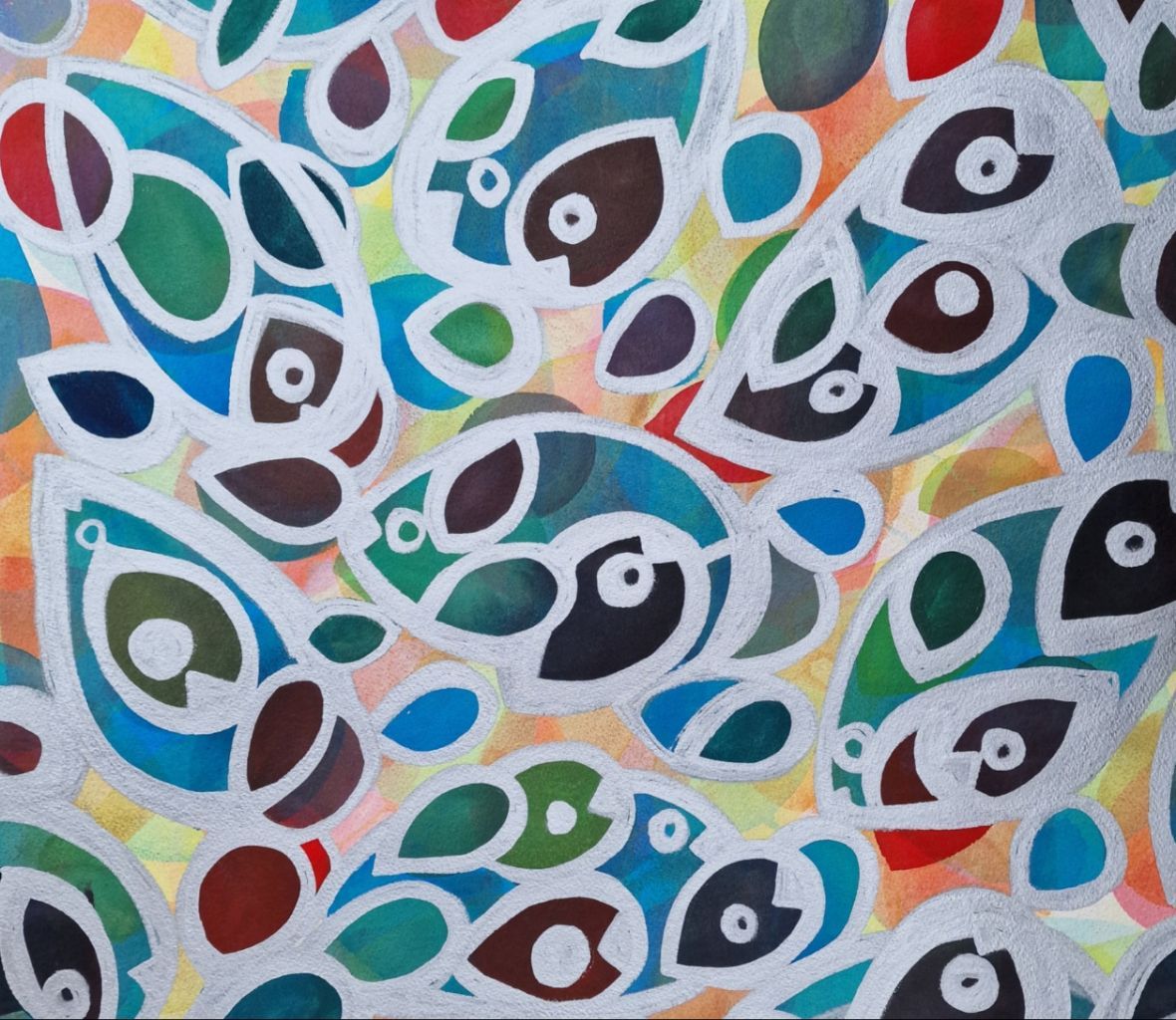 I love the painting process, my bright and joyful palette expresses my feelings of positivity when immersed in the process of painting surrounded by nature. My intention is to explore and express these feelings and energies to my audience through colourful marks and energetic, intertwining lines. My Melbourne studio is home, a self-build barn conversion surrounded by agricultural fields an ever-changing landscape. There are always animal antics to amuse me and up above skylarks sing in the air.