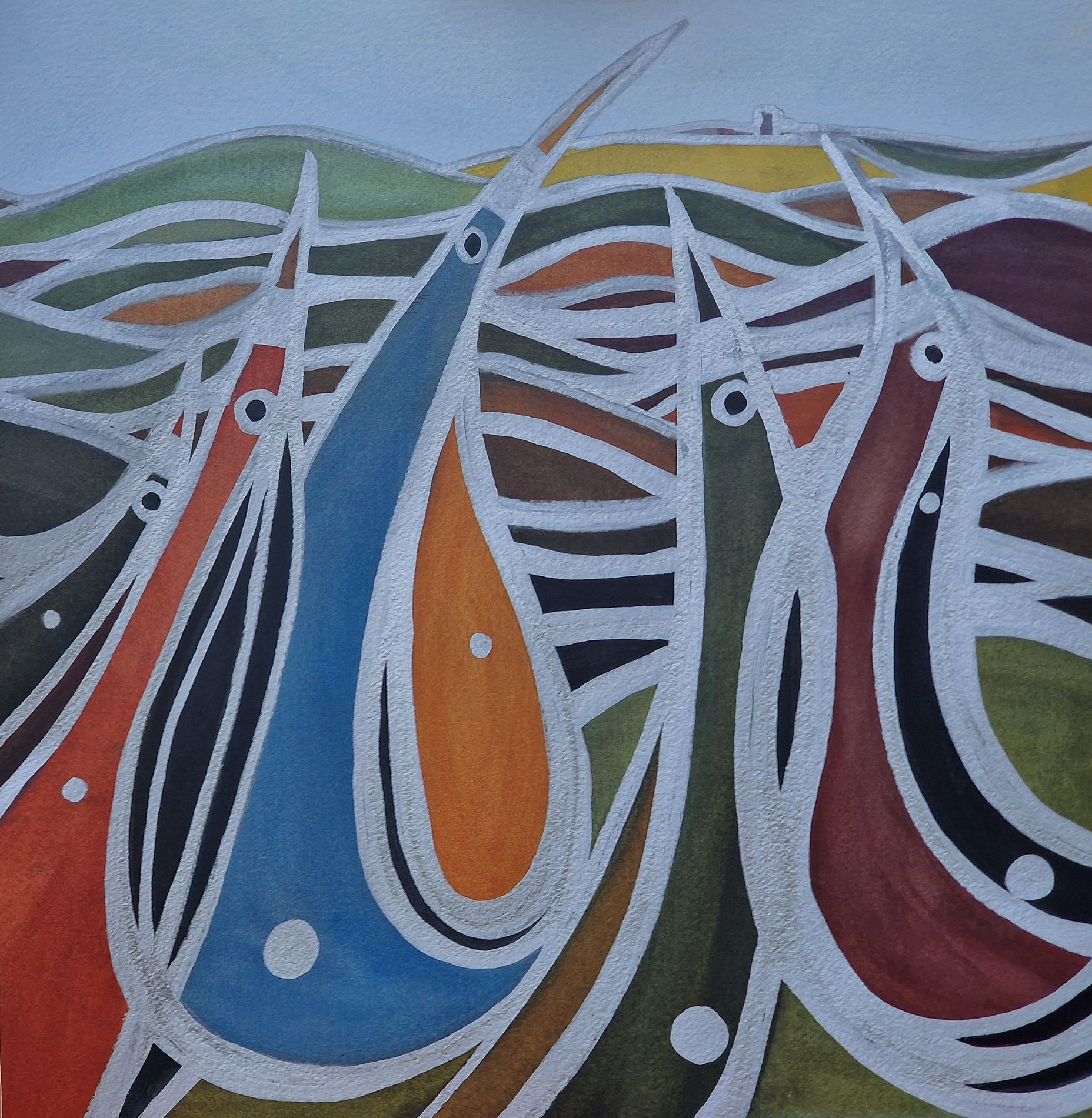 I paint vibrant abstract watercolour paintings. More recently, I am thinking about my desire for open landscapes, undulating rolling hills and far-reaching views. I am thinking about ancestral lands and genetic memory motivated with my own recent journey of discovery meeting my own biological family and discovering where our ancestors came from, what they did. What I discovered were the landscapes I had already been drawn to and activities I already enjoyed and skills I shared. Last year's focus was a celebration of seasons and the shapes of budding flowers, leaves and pears. I enjoyed too the colours of the land in my line-ups of bird shapes. I can see the earthy tones in my new work moving forward to 2026, I would love you to join me on this artistic journey.